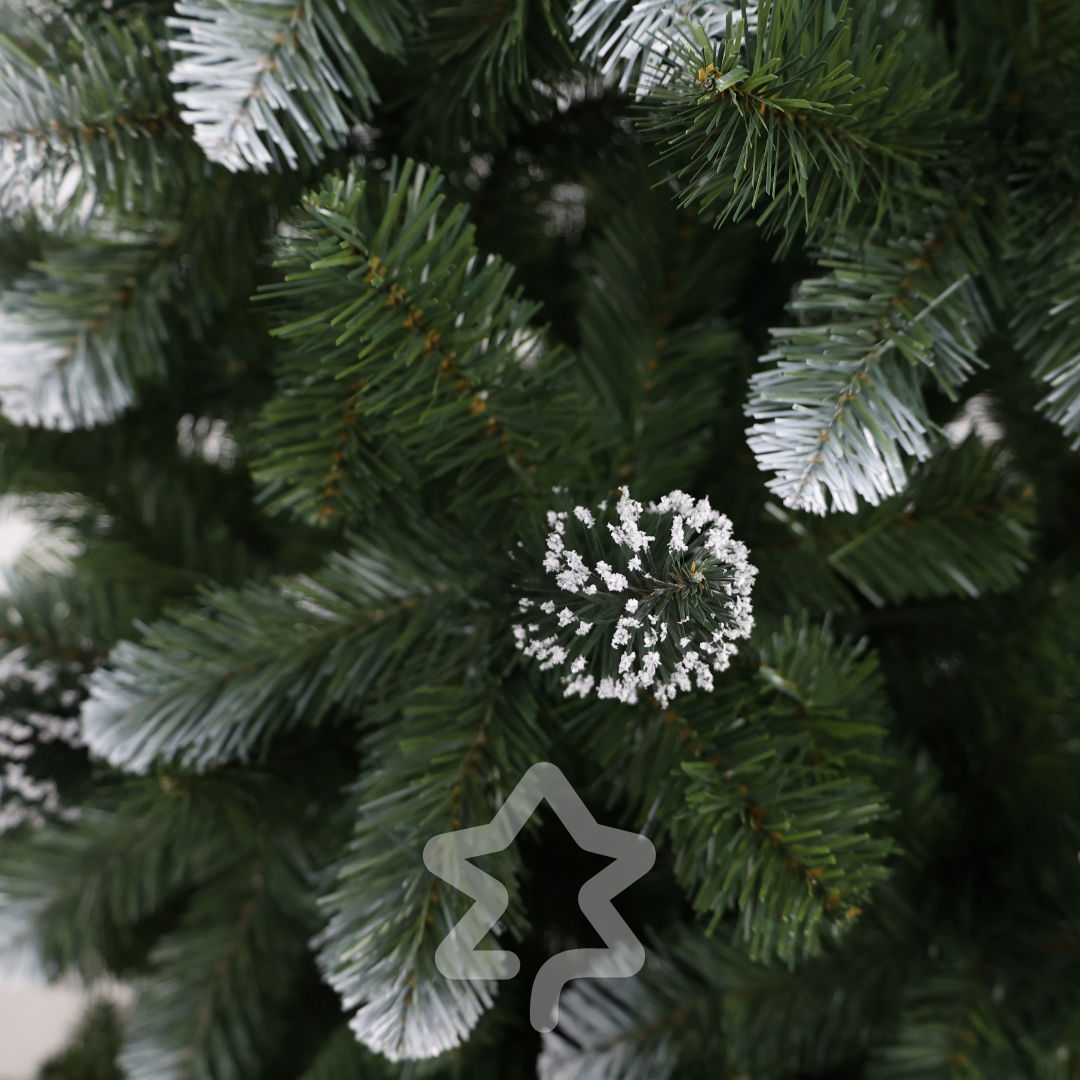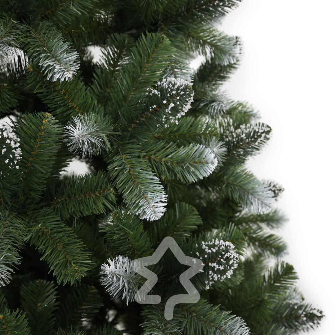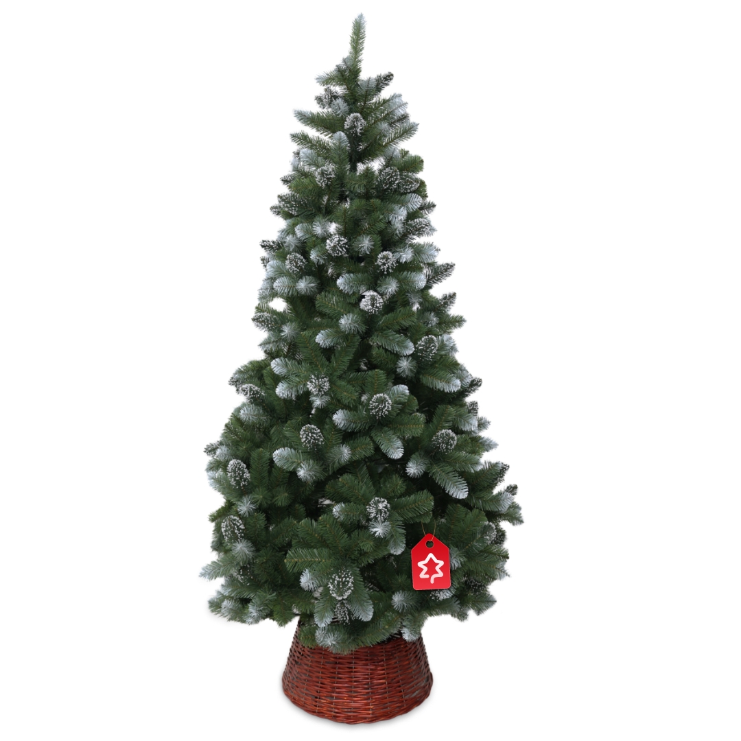 Borovice zasněžená 210 cm se vyznačuje dlouhým jehličím a plným, nadýchaným vzhledem a jemným zasněženým efektem, který navodí zimní atmosféru.
